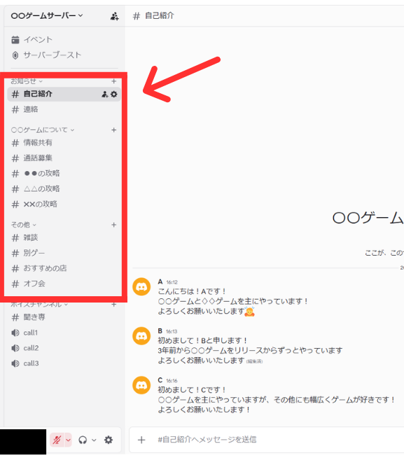 そのままの意味で「自己紹介」のチャンネルでは自己紹介「雑談」のチャンネルでは雑談といったように、用途を分けてそれぞれチャットをすることが出来ます。