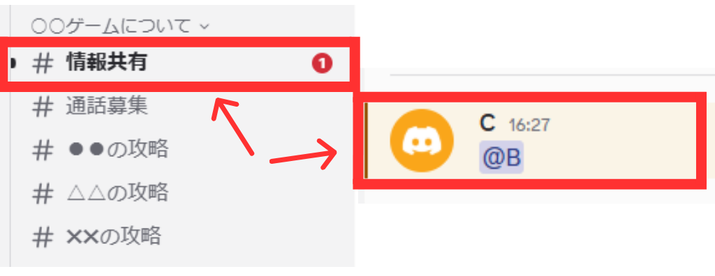ちなみに相手側にはメンションがあったチャンネルの横に赤い文字で①と出て、テキストチャンネルではオレンジ色の文字で強調されます。