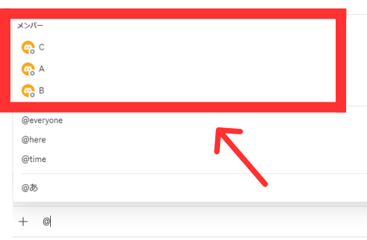 「@」を押すと以下写真のように出てくるので用事がある相手の名前を押して送信します。