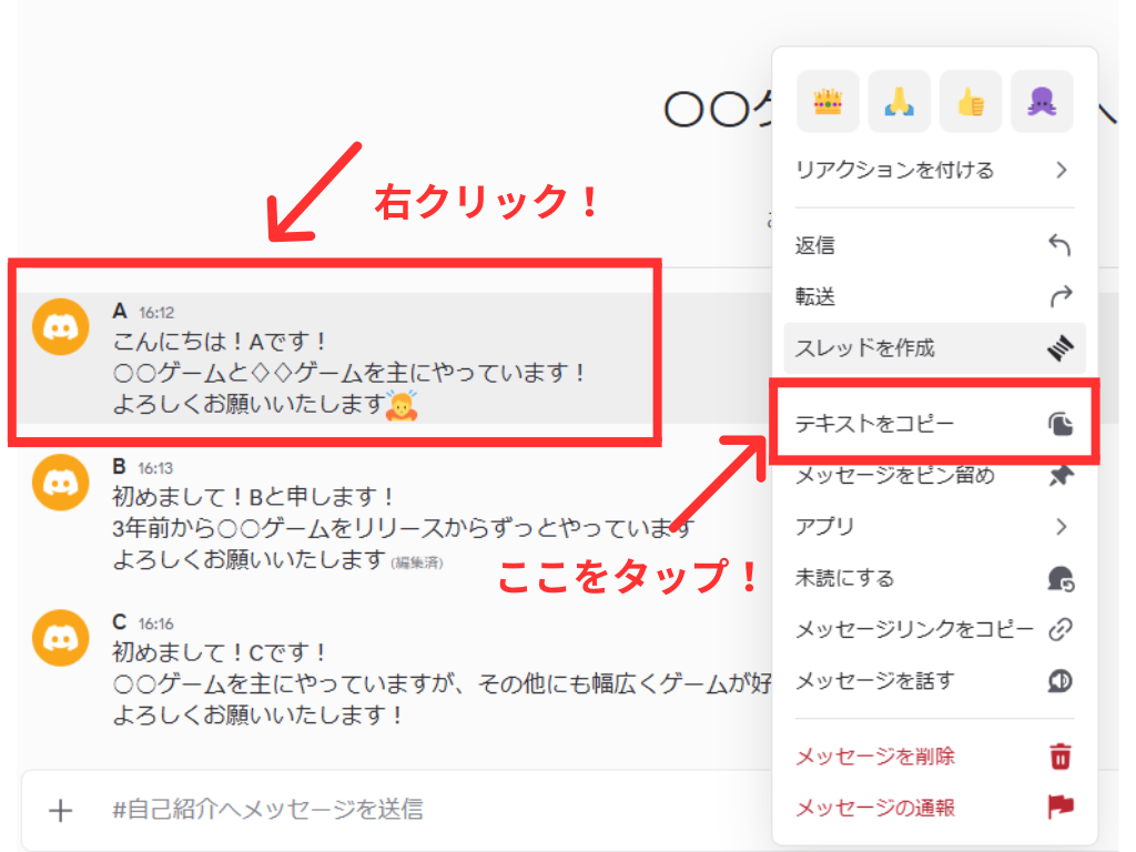 Discordでは文を右クリックするだけで一括コピーが可能なので意外と便利な機能となっております。