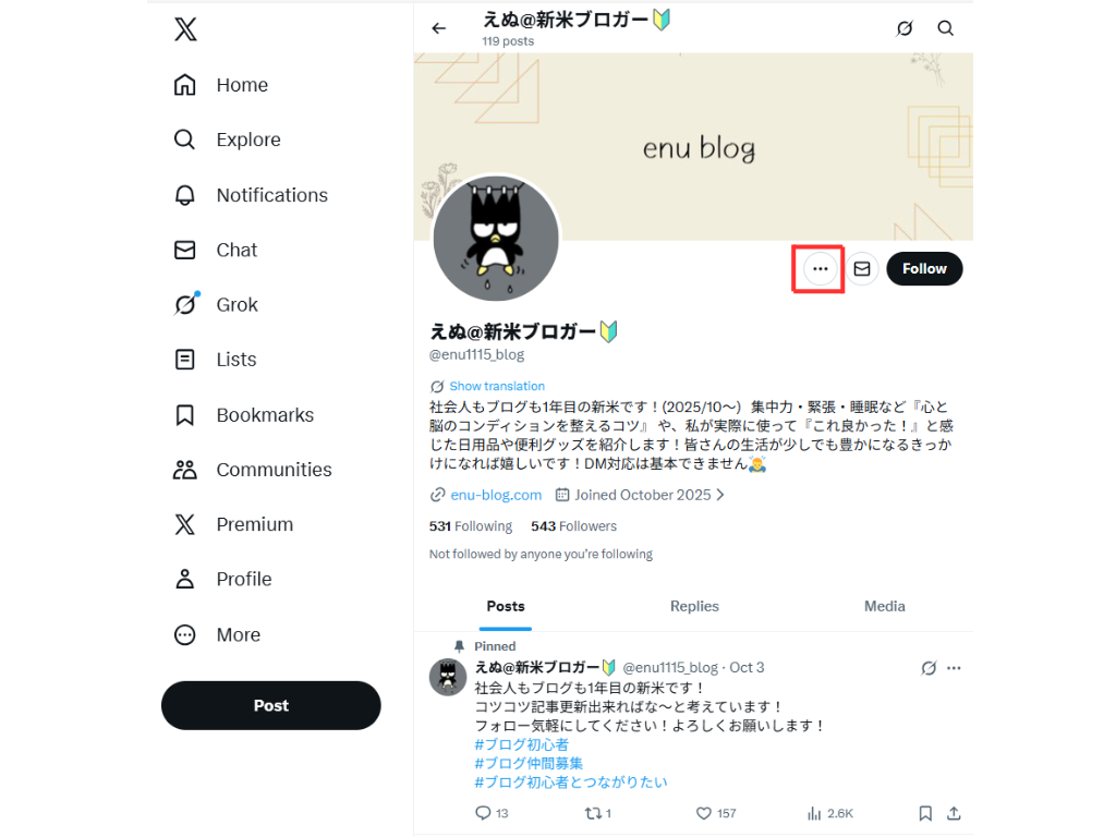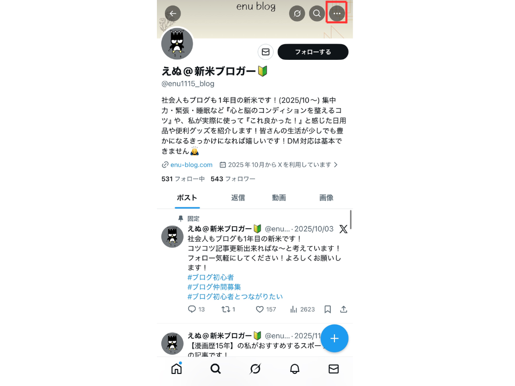 1 ミュートまたはブロックしたい相手のプロフィール画面を開き、右上の「・・・」を押す