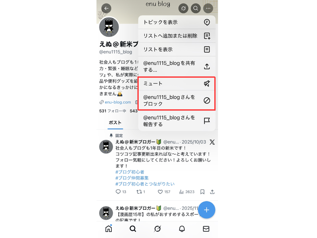 2 ミュートにしたい場合は「ミュート」ブロックしたい場合は「@〇〇〇さんをブロック」を選択