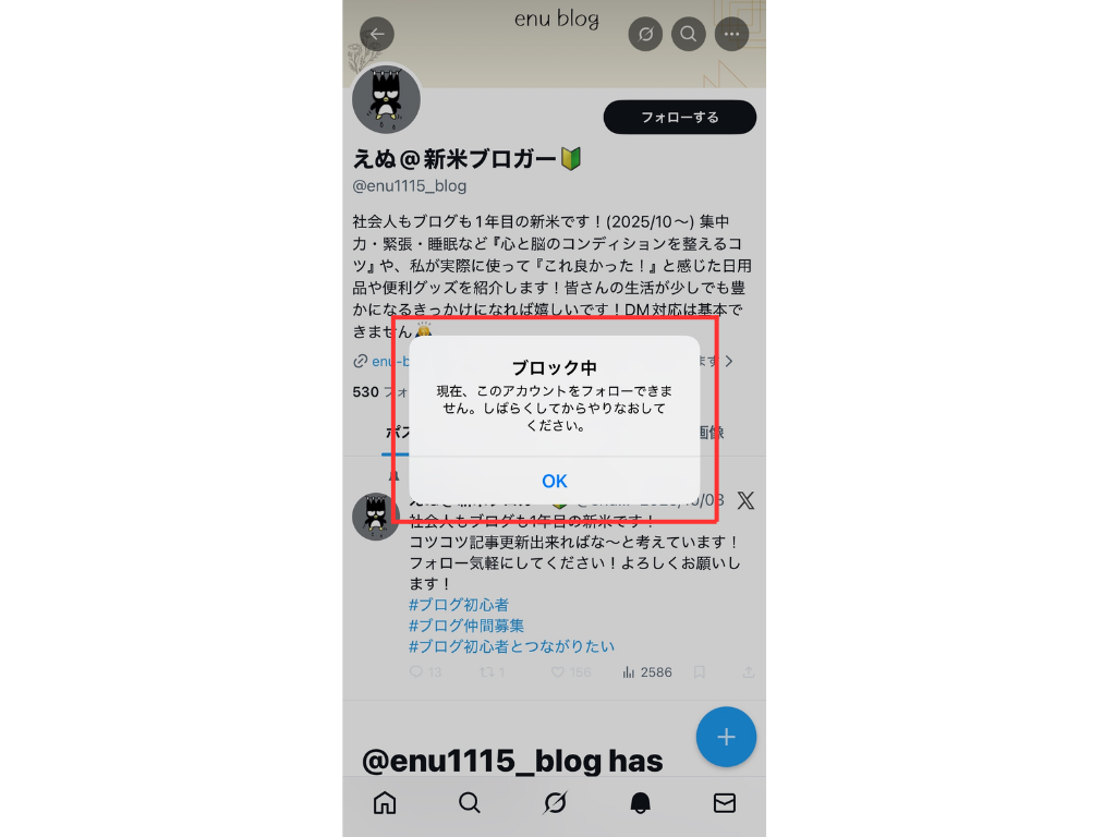 フォローボタンを押しても下記のような画面になり、フォローすることはできません。