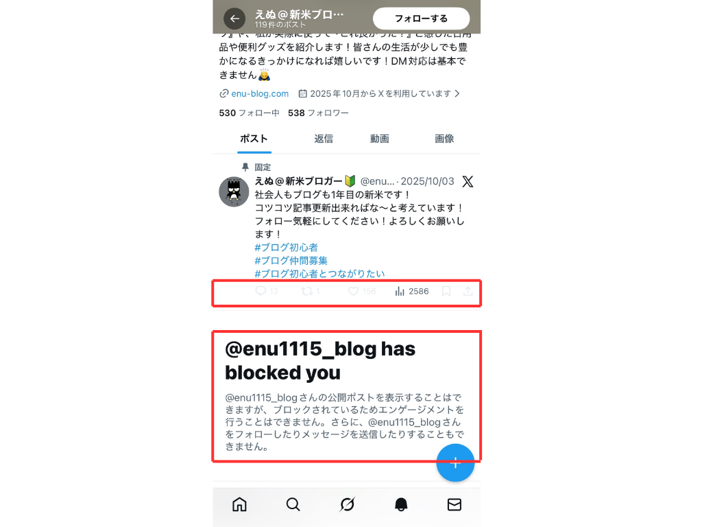 下記画面のようにブロックされると「@〇〇〇 has blocked you」という文字が表示され、