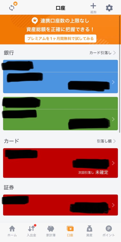 最初に銀行、カード、証券の情報を入力するだけで、あとは勝手に更新していってくれるのです。(現金使用以外)