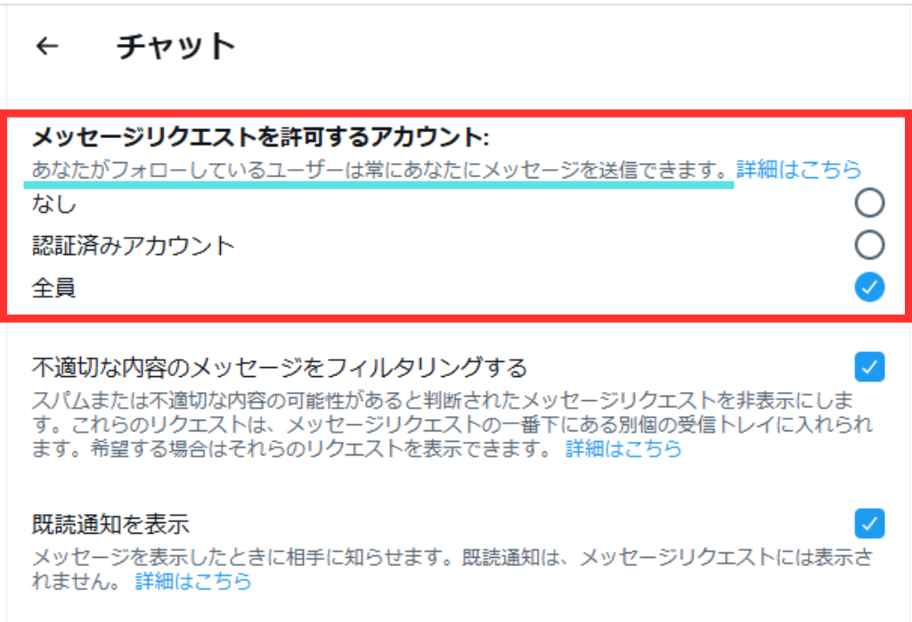 ③「全員」を選択すると、あなたがフォローしていないアカウント全てにメッセージリクエストの制限がかかります。